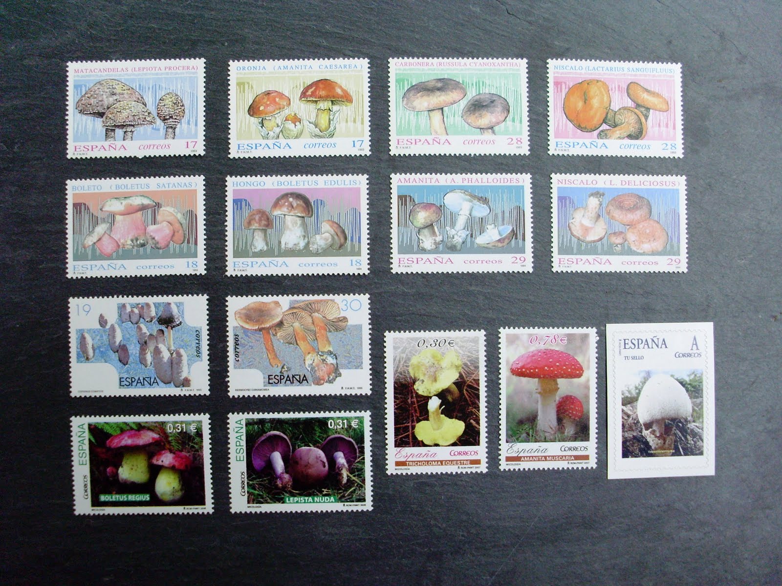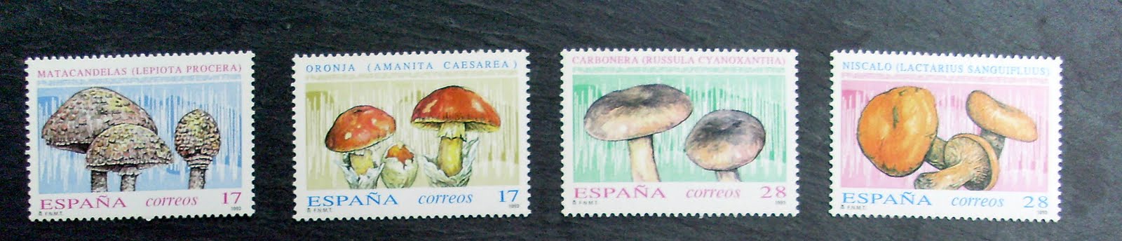 A los pocos meses, se recibe contestación de la Dirección de Programación de Correos, comunicando la aprobación de la emisión solicitada, y es el 18 de marzo de 1993 cuando aparecen en España los primeros sellos de Micología Clasificada, – recordemos que el primer signo postal de España fue utilizado el 1 de enero de 1850, con la efigie de Isabel II -; siendo cuatro valores faciales; dos de 17 pts. Macrolepiota procera y Amanita caesarea y dos de 28 pts. Russula cyanoxantha y Lactarius sanguifluus. El 18 de febrero de 1994 se ponen en circulación otros cuatro valores faciales; dos sellos de 18 pts. Boletus satanas y Boletus edulis, y dos de 29 pts. Amanita phalloides y Lactarius deliciosus. En 1995, el 9 de febrero, son dos los valores faciales que se ponen en circulación; 19 pts. Coprinus comatus y 30 pts. Dermocybe cinnamomeus. Ya no es hasta el año 2007 cuando de nuevo se emiten, el 1 de junio, dos valores más; 0,30 euros Tricholoma equestre y 0,78 euros Amanita muscaria. En el 2008, el 10 de octubre, se ponen en circulación dos valores postales de 0,31 euros Boletus regius y Lepista nuda. Para el año 2009, ya ha comunicado la Dirección de Correos las emisiones que sacará y entre ellas está la de Micología Clasificada; serán dos sellos, Cantharellus cibarius y Boletus pinophilus, sin especificar los valores faciales.