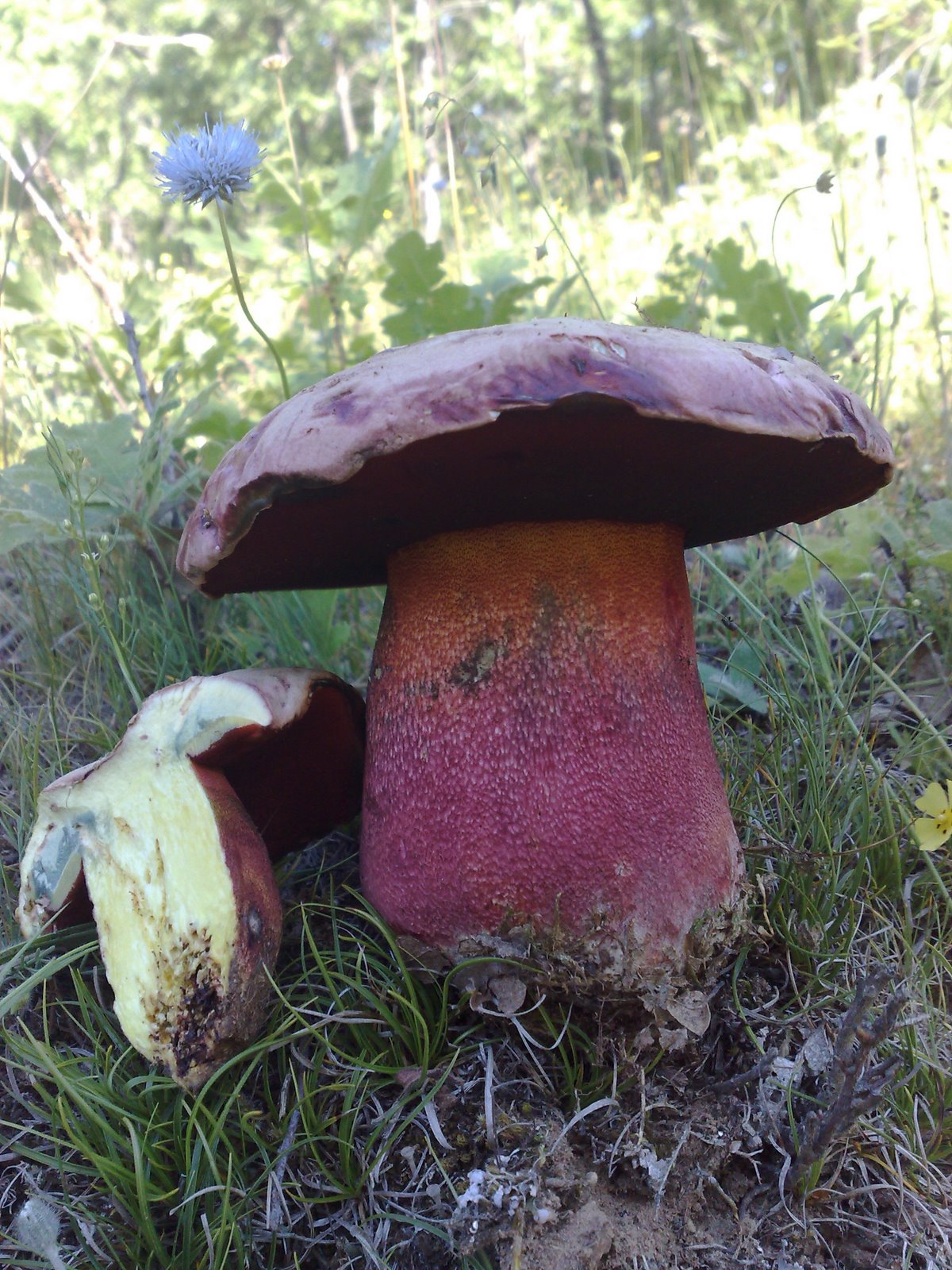Estuve pensando no darle réplica. No quiero hacer un » casus belli”. Así se escribe la historia. ¡La tergiversan! Pero Señor ¿que hemos hecho para merecer esto?. Eran las 8 de la mañana porque el Presidente de la Asociación Micológica San Jorge, tuvo que sacar sus galones cuando iniciamos la partida; si no hace uso de ellos da la hora de echar » la parva», es decir hacia las 11 de la mañana. Podéis creerme, me acompañaban dos perezosos. ¡Cuesta trabajo moverlos! Madrugaron una vez que se cayeron de la cama. De esto hace ya años. La cambiada de mano vino a reiterada y reiterativa petición del Sr. Cerezal. Ellos eran reacios, no entienden que » cuando en los sembrados crecen las amapolas sangrientas» (que diría el poeta) , el campo se resquebraja de calor, se agrieta, y hay que buscar las zonas más húmedas para poder ver algún vestigio de vida. Se apostó y apostilló que era un B. luridus, hasta llegar al convencimiento de que era un B. caucasicus. Borde del sombrero rodeado de una orla color naranja ( fijaos en la foto), pero el detalle característico: la carne de un color amarillo vivo y que permanece inmutable ( no torna a azul) y la base del pie vira a rojo( sin llegar a ser como en el B. queletii). Termino, no quiero ser muy duro, creo que fue Friedrich Dürrenmatt quien sentenció:» MALOS TIEMPOS CORREN, CUANDO ES NECESARIO DEMOSTRAR LA EVIDENCIA».