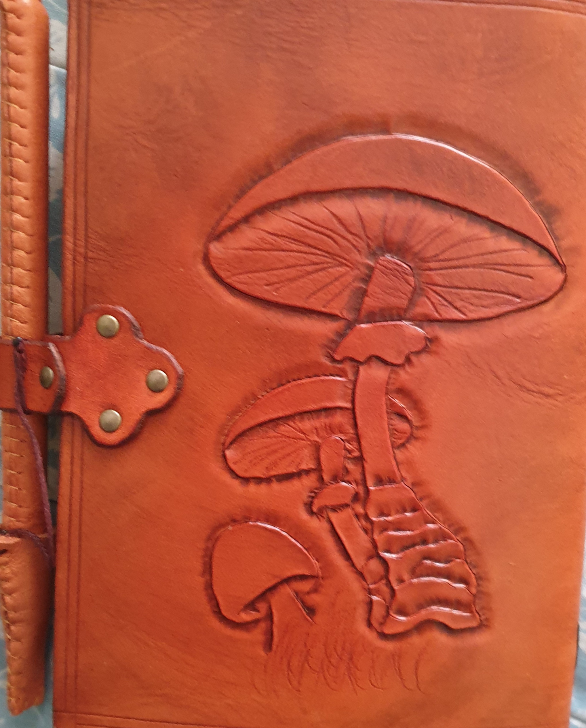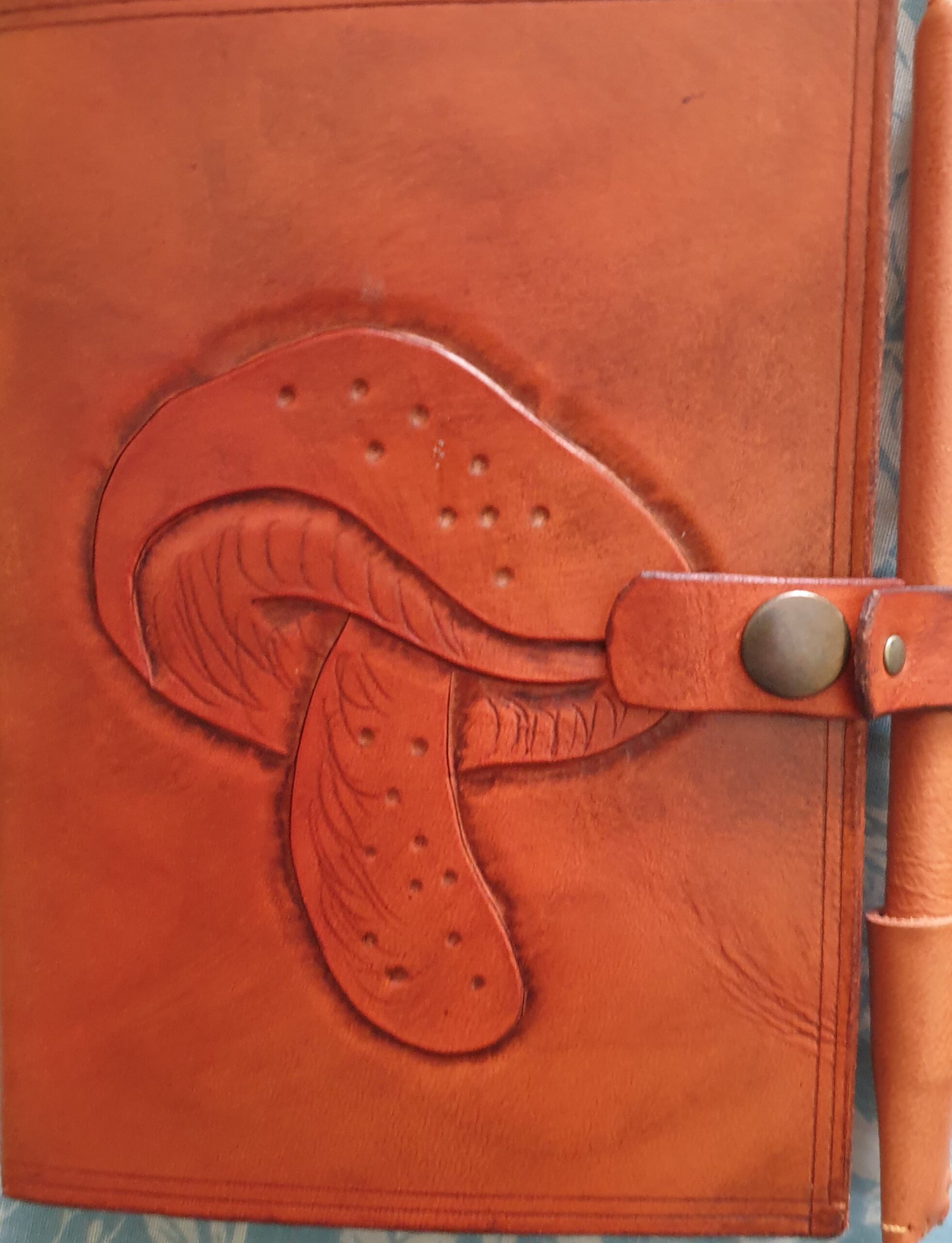 una libreta de campo personalizada de cuero natural, cortada, repujada, tintada
