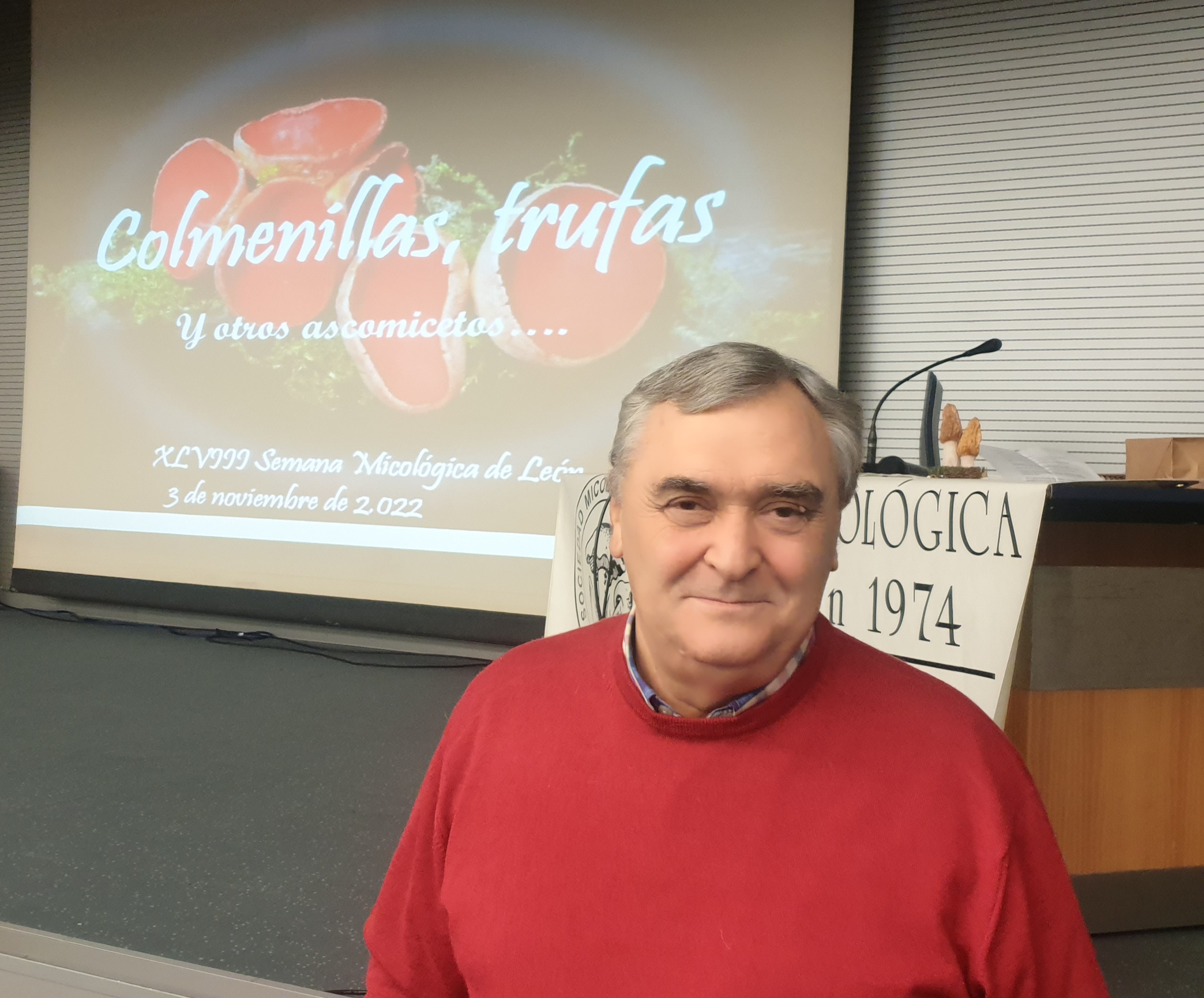 Uno de nuestros veteranos, Juan Antonio Sánchez Rodriguez, nos daba una charla sobre «Colmenillas, Trufas y otros ascomicetos» y el mejor de los inicios era la solemne imposición de la Insignia de Oro de la Asociación al conferenciante, aprobado ello en Junta Directiva a propuesta de un grupo de socios. Después de todo es el máximo reconocimiento que puede otorgar San Jorge.