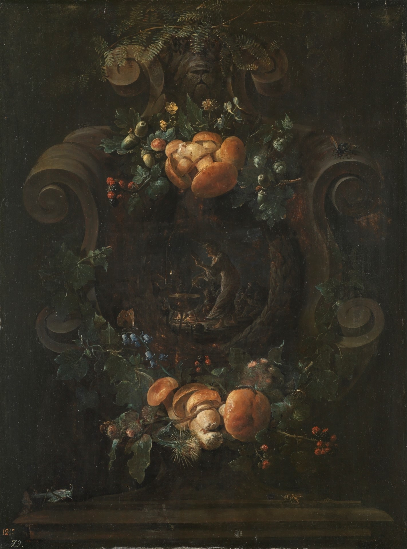 el Museo del Prado encontramos setas, p.ej. en la obra “Guirnalda con florecillas y setas y escena de brujería”, S. XVII. Óleo sobre tabla, 63 x 48 cm, anónimo. Sobre éste en la web leemos