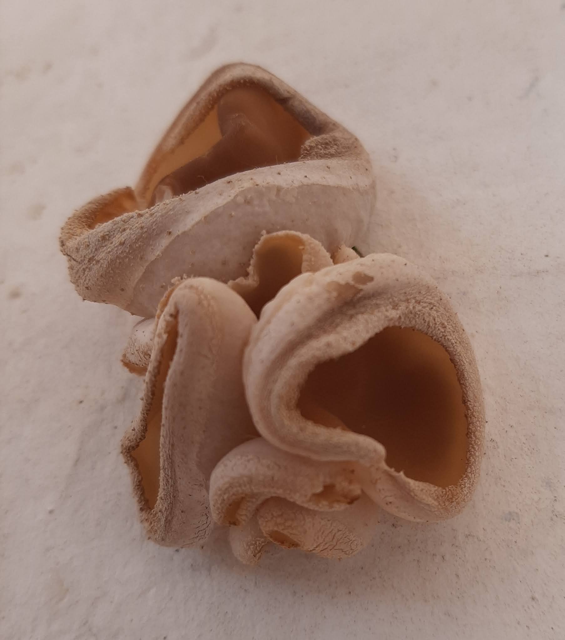 Fotografía.- Tomada en estos días en un pueblo del Valle de Vidriales (Zamora) vecino a la provincia de León, en una grieta sobre una pared de adobe de una vieja cocina de leña revodada con cemento. Al estar hecho con tierra y paja, el adobe contiene con toda seguridad restos de gramíneas, algo típico también en el sustrato base para estas Pezizas. El ejemplar carnoso de la imagen estaba aún en fase joven.