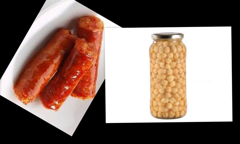 Bandejita pequeña de setas o champiñones laminados. Garbanzos de bote. Ajo,