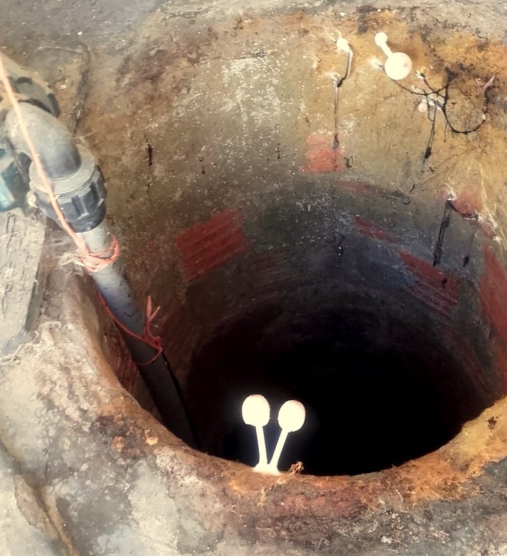 del brocal, sobre una superficie de cemento y ladrillo, aunque a la vez sobre