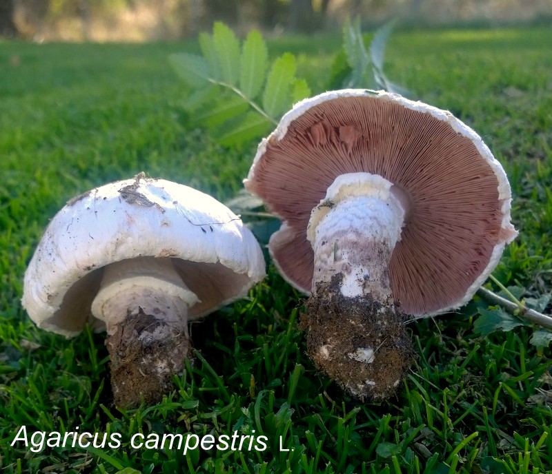 Descripción.- Es uno de los Agaricus mas frecuentes. De talla media con la cutícula de color blanquecino, pero pudiento tirar a pardo y escamoso con el desarrollo. Las láminas rosadas de arista concolora acaban siendo pardo negruzcas. El pie mas o menos largo o mas o menos corto con un anillo súpero y la tendencia a amarillear ligeramente en la base del pie y a enrojecer en el sombrero, nos permiten reconocerla. Las esporas son pardo oscuro, casi negras de hasta 8 micras.