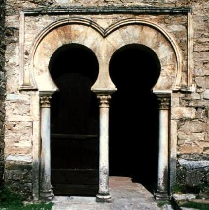 dos arcos geminados de herradura al estilo califal, sobre tres columnas de