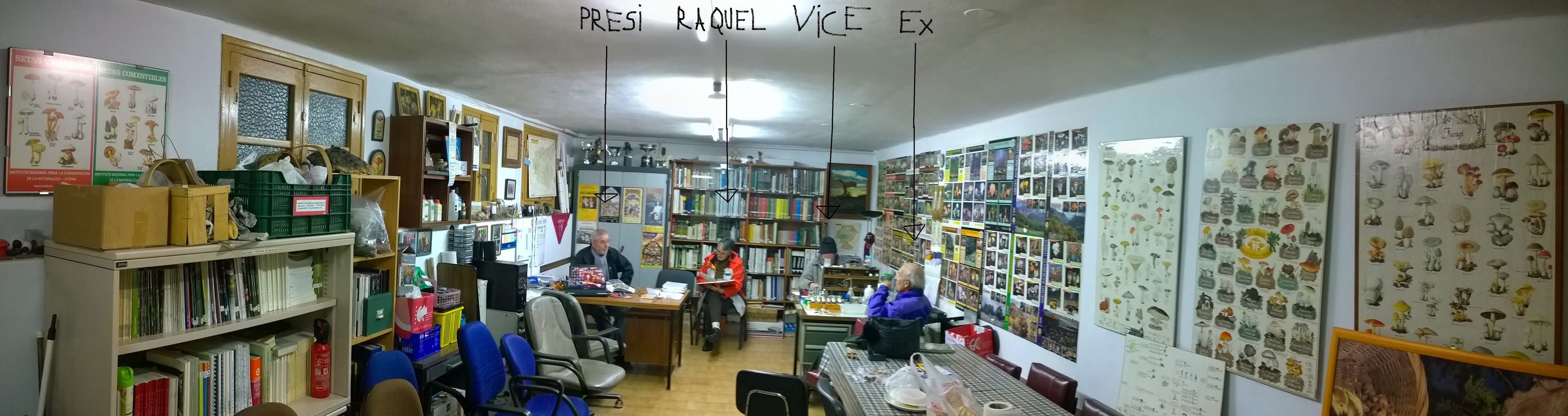 Dispone esta sala de Redactores de varios ordenadores, material de oficina variado, una mesa-comedor de juntas, biblioteca micológica surtida, microscopios y reactivos, amén del frigorífico, vajilla y cuberteria y por supuesto de unos esplédidos fogones, donde regularmente, y más en temporada, se desarrolla el estudio reológico de las setas con gran alboroto y algarabía.