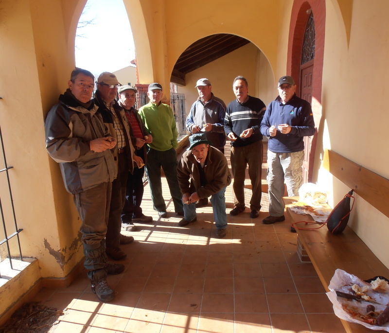 Las huestes ponen rumbo, ya con mucho nerviosismo camino de la majada que se les ha indicado por el experto y aparecen en lontananza como los molinos de nuestro Quijote los ansiados pinos. Y hete aquí que surge la primera decepción: son pinus pinaster. Después de una mínima prospección por la zona, aparecen mezclados pinus silvestris, pero nada de roble y los pinos todavía algo jóvenes. Reunión y cónclave para poner pies en polvorosa en busca de otros lares próximos para localizar mejores hábitats. Eso decían ellos. No era cierto. Buscaban donde avituallarse de pan ya que el chorizo y el vino lo tenían ya a buen recaudo. Pues bien lo encontraron, y enseguida alguien conocedor de la zona, propuso y todos excepto el plumilla asintieron en dirigirse a dar cuenta de el «comercio y el bebercio» en el lugar adecuado que resultó ser el pórtico de una iglesia (tan religiosos ellos) pero el porteador de la bota de vino, con el taimado fín de que no se pudiera beber el preciado líquido, apretóla tan fuerte que se llegó a temer tener que acompañarse de agua de la fuente para el refresco del gaznate. Lo que no esperaba él es que entre los expedicionarios hubiera un experto en descerrajar botas, como así ocurrió y resumiendo, dieron buena cuenta de corras (en plural) de chorizos, bota de vino de 2 litros y chapata grande de pan. Esta era la salida que los muy ladinos tenían preparada. No preguntaron por la hora de la misa aprovechando el sagrado lugar del condumio en la Iglesia de Secarejo.