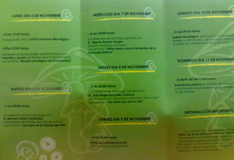 Hace unas semanas archivosdemicología se aventuró al dar a conocer al mundo el programa de la XXXVIII Semana Micológica de León. organizada por la Asociación Micológica «San Jorge». Nos lanzamos a pecho descubierto y acertamos al 100%, como puede apreciarse en el programa de actos que se incorpora.