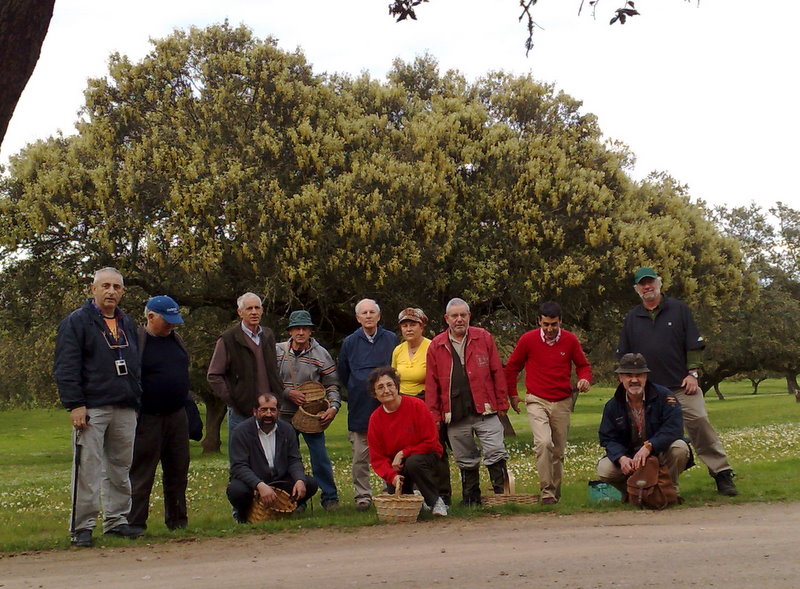 Obsérvese la foto del grupo de recolectores, donde se echa en falta a un miembro, que anduvo de “excursión fuera de programa “ por las dehesas extremeñas, donde por cierto es bastante fácil perderse, y que mantuvo en vilo al resto de los asistentes, aunque al fin y al cabo, fuera uno menos a repartir el botín. Se clavaron en diferentes encinas carteles como el de la muestra.