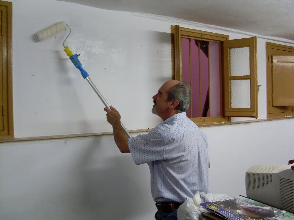 Con más voluntad que medios (baste de ejemplo que hubo que reciclar el cubo y la fregona atándola con un alambre para poder aprovecharla) se fueron completando las distintas fases de la operación: desplazamiento de mobiliario y enseres con el doble fin de protegerlos y de que no estorbaran; limpieza previa de telarañas -omnipresentes dondequiera que haya algo estático- polvo y basura acumulados; eliminación de desconchones a base de espátula, detección y eliminación de grietas para dar las pertinentes manos de pintura, incluidas ventanas, contraventanas y sus barrotes, etc. y luego volver a colocar todo en su sitio.