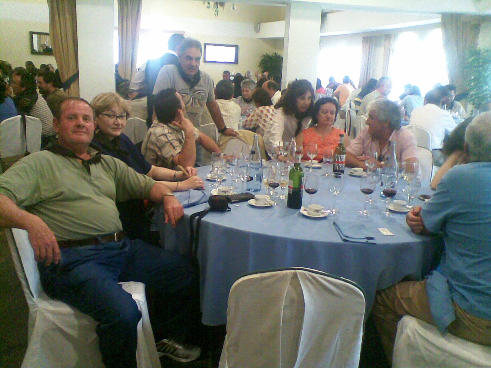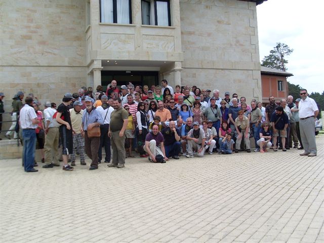 De vuelta de las excursiones quedó poco tiempo para la ruta enológica, unos 15 minutos por el retraso en la vuelta. Por ello, sin más, nos llevaron al Restaurante La Reserva, cerca de San Leonardo de Yagüe para reponer fuerzas y llenar los depósitos. Antes de entrar nos hicimos la consabida foto de grupo. Un buen ágape, en mesas redondas, al estilo de las bodas, a base de: cogollos de Tudela con salmón ahumado, rollitos de bechamel con sabor a hongos, recubiertos de gulas, pimientos rellenos y entrecot. Postre de tarta de queso, café y chupitos ¡qué más se puede pedir por el módico precio de la participación!