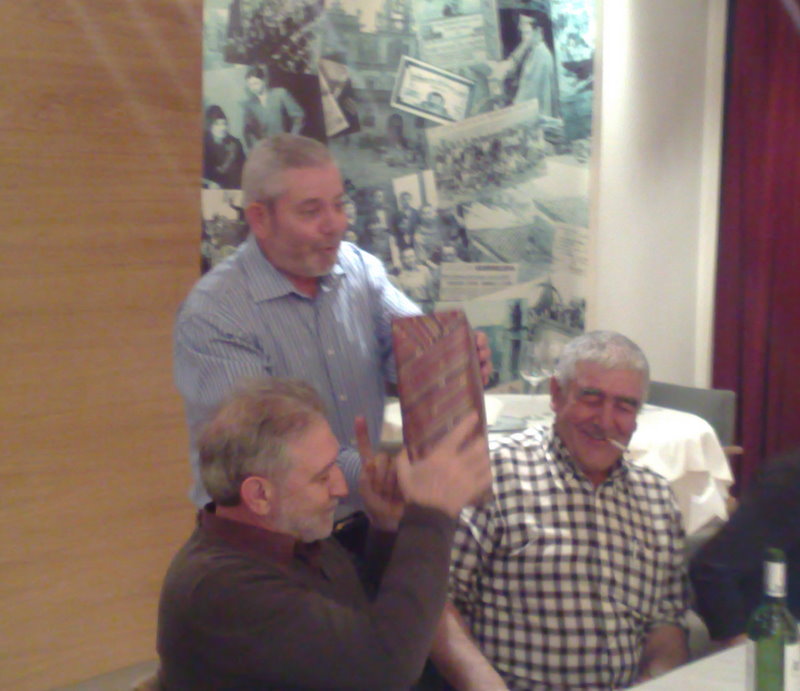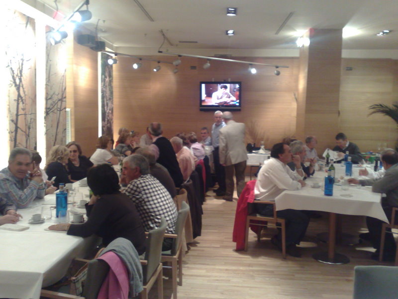 Fué por ello, o quizá no, por lo que un variado y selecto grupo de socios se citó a la hora conveniente a la puerta del restaurante elegido(“Gallego responsabilitem”) para dar cuenta de la celebración y de la viandas dispuestas al efecto. Ni que decir tiene que cumplimos con lo que esperaba de los asociados quedando las botellas vacias.