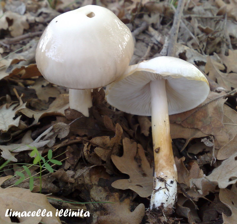DESCRIPCIÓN.- Pertenecen las Limacellas a la misma familia que las Amanitas , a pesar de carecer de volva, siendo característica su grandisima viscosidad. Presenta esta seta una coloración de sombrero, láminas y pie de tonos muy blancos en su desarrollo normal. En ocasiones se aprecia un anillo de caracter viscoso-glutinoso, con el aspecto de ser un brochazo de leche condensada. Tal es su viscosidad, que se hace realmente imposible el pinzarla entre los dedos. Se aprecia esta viscosidad mas claramente en el margen del sombrero. Crece en otoño en grupos de 2 o 3 ejemplares en bosque húmedos.